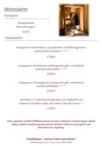 Die breit gefächerte Speisekarte umfasst neben Suppen und Vorspeisen, Fleisch- und Fischgerichten, Desserts auch eine Vesperkarte sowie interessante Kreationen für den Vegetarier.